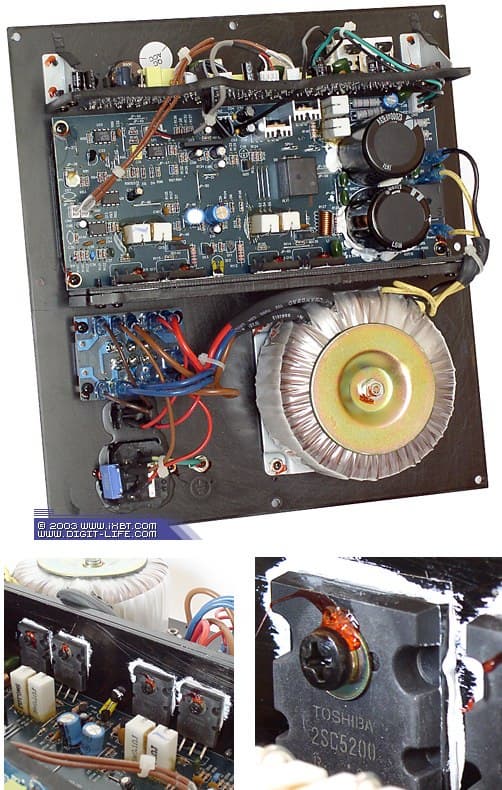 А вот фотография «мозгов» сабвуфера. На тыльной стороне металлической задней панели разместился блок питания на основе тороидального трансформатора, кроссовер, усилитель мощности на четырёх транзисторах Toshiba 2SC5200 и сопутствующая «обвязка».