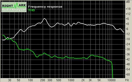 Уровень искажений весьма невелик: в диапазоне 250 Гц — 6,5 кГц он не превышает 0,5%, а после 6,5 кГц вообще уходит за границу графика (то есть, 0,1% и ниже). Относительно небольшой пик (чуть больше 1%) наблюдается в районе 170 Гц, а с понижением частоты (40 Гц и ниже) искажения традиционно возрастают, однако даже на самых низах их уровень не превышает нескольких процентов. То есть, в целом уровень искажения можно назвать очень низким.