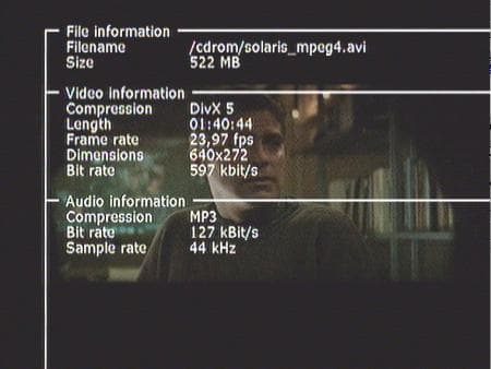 Начнем с современного диска, закодированного DivX 5. Картинка на экране почти неотличима от DVD. Никаких торможений и рассыпаний картинки, прекрасный звук DolbyDigital, есть даже поддержка субтитров. Уже реализована поддержка GMC и в скором времени обещана поддержка QPEL.
