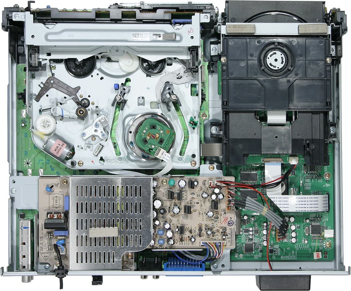 Электронная начинка рекордера размещена на трех платах: питания, видеомагнитофона и DVD-рекордера. Функциональность рекордера основана на высокоинтегрированном мультимедийном процессоре DMN-8602 от LSI Logic. Несмотря на обилие интерфейсов и функций, реализованных в данном чипе, на платах рекордера находится довольно много вспомогательных микросхем. Например, в DMN-8602 встроено 6 видеоЦАП, но рядом с этой микросхемой находится чип SAA7128H от Philips, который также может преобразовывать цифровые цветоразностные сигналы в аналоговый вид (композитный, S-Video, компонентный и RGBS).
