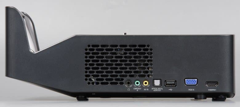 Проектор имеет необычную форму в виде вытянутого вдоль оси проекции бруска, тогда как обычно проекторы напоминают положенную на бок книжку. Корпус проектора изготовлен из пластика с темно-серым серебристым матовым покрытием (производитель называет этот цвет титановый черный). Покрытие не маркое и относительно устойчивое к появлению царапин. Воздух для охлаждения внутренностей забирается через решетки на правом и на левом боках и выдувается вперед через фронтальную решетку. Фронтальной частью мы называем панель корпуса, обращенную к экрану.