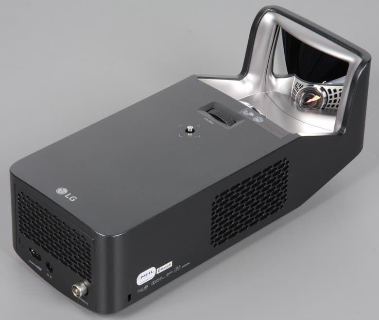 За боковыми решетками находятся по одному небольшому громкоговорителю, каждый в своем боксе, окруженном демпфирующими прокладками из мягкого пористого материала. За передней решеткой можно разглядеть два небольших вентилятора, работающих на выдув. Под решеткой расположены один из двух разъемов HDMI (который с поддержкой MHL), разъем питания и антенный вход. Отметим, что решетка и разъемы на передней панели исключают вариант проекции на стол вертикально вниз, когда проектор просто стоит вертикально на столе. А жаль. На задней панели (она обращена к зрителю с пультом в руке) находится окошко единственного ИК-приемника и крошечный индикатор состояния, который неярко светится красным в режиме ожидания. На правом боку расположены остальные интерфейсные разъемы, а на левом - разъем для кенсингтонского замка. Пятипозиционный джойстик (нажатие и отклонение в четыре стороны) находится примерно по центру на верхней панели. Позади него выступает из корпуса ребристое колесо фокусировки.