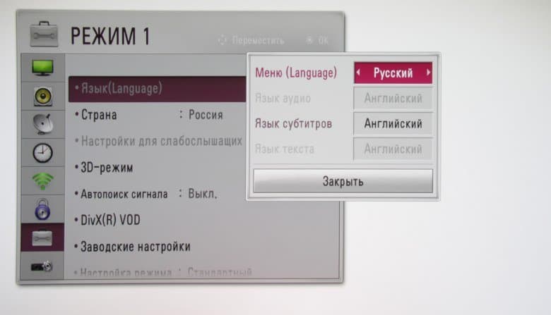 При этом следующий/предыдущий параметры выбираются стрелками вниз и вверх. Есть русская версия экранного меню.
