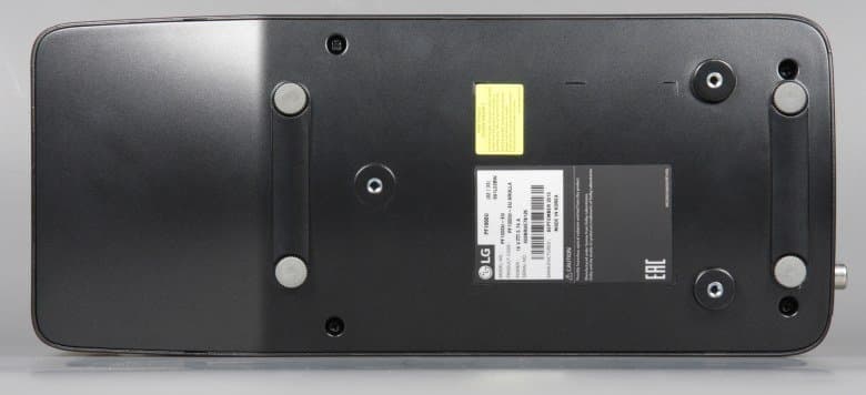 Стенки и дно указанной ниши изготовлены из пластика с серебристым покрытием. Отметим, что при настольной установке проектора эта ниша будет своеобразной ловушкой для пыли, которая будет оседать на дне, стенках, на линзе объектива и, что хуже всего, на зеркале. Поверхности зеркала и внешней линзы относительно стойкие к появлению царапин, но все же они могут быть поцарапаны во время чистки (на нашем экземпляре царапины уже были). Поэтому чистить линзу и зеркало стоит очень аккуратно и лучше бесконтактным способом, сдувая пыль струей воздуха. Расположенные на днище четыре ножки с резиновыми подошвами и стальными резьбовыми стойками выкручиваются из корпуса проектора примерно на 3,5 мм, что позволяет выровнять проектор, поставленный на стол или тумбочку. Также на днище есть три резьбовых отверстия в металлических втулках, их можно использовать при монтаже на потолочном кронштейне.