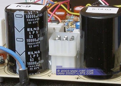 В сглаживающем фильтре питания применяются два конденсатора Elna LP5 ёмкостью 10000 мкФ каждый.