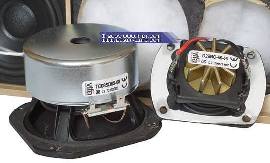 Поскольку во всех трёх моделях (LCR 35 / LCR 35c / LCR 25) используются совершенно одинаковые динамики, далее про них упоминать мы уже не будем. Итак, в качестве НЧ/СЧ драйверов используются миниатюрные динамики Vifa TC08SD69 c крошечным 6,5-сантиметровым диффузором из бумажной массы, резиновым подвесом и экранированной магнитной системой. К сожалению, на сайте эта модель не представлена. Возможно, она выпускается только как ОЕМ продукт для различных изготовителей АС. Высокочастотник также производства Vifa (Дания) — это модель D26NC с дюймовым (25 мм) тканевым куполом, и неодимовым магнитом.