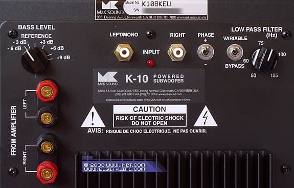 Можно использовать традиционное подключение сабвуфера к линейному выходу или выходу предварительного усилителя ресивера или просто стереофонического усилителя. Для этого на задней панели К-10 присутствуют два разъёма RCA. В случае подключения сабвуфера к выходу предварительного усилителя канала сабвуфера на ресивере, задействовать можно один вход RCA, который в таком случае является монофоническим.