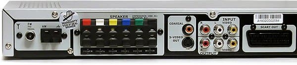 С обратной сторона плеера находятся: несъемный шнур питания 1,5 м длиной, разъем SCART, блок RCA разъемов (входы и выходы), S-Video выход и коаксиальный цифровой аудиовыход. Кроме того, имеется шесть клеммников для подключения акустических систем, клеммник для подключения длинноволновой антенны и RF гнездо для подключения кабеля антенны ультракоротких волн.
