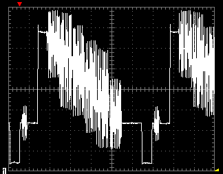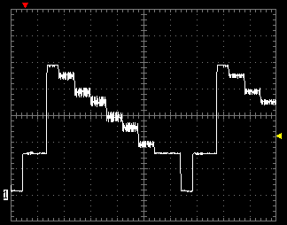 Третья осциллограмма показывает линейность видеоЦАПа. В идеале размер ступенек должен быть одинаков. Для этого теста осциллограф подключался на яркостной канал S-Video видеовыхода, нагруженный на резистор 75 Ом. Вертикальный масштаб — 0,2 В/деление, горизонтальный — 5 мс/деление. На осциллограмме явно видны наводки от канала цветности, что свидетельствует о плохой экранировке цепей видеосигнала.