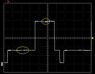 Вторая осциллограмма показывает уровень шума видеоЦАПа плеера. Тестовая картинка содержит черное и белое поля, имеющие вертикальные полосы с отклонением яркости в 1%. Желтым цветом на осциллограмме отмечены места расположения полос.