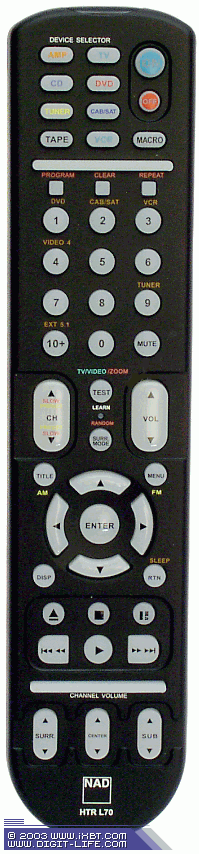 В комплекте с L 70 идёт многофункциональный обучаемый и программируемый пульт NAD HTR-2. Но, так как некоторые кнопки перемаркированы под нужды L 70, а сам пульт уже запрограммирован на управление DVD-ресивером L 70, то пульт назвали HTR L70.