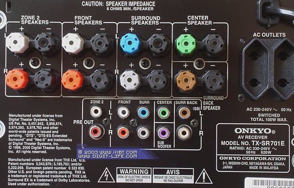Аналогичны оным у модели TX-SR 601E, за исключением появившегося выхода предварительного усилителя для «зоны 2». Теперь в другой комнате можно установить лишь пару активных АС или колонки с усилителем мощности, а громкостью второй аудиосистемы управлять непосредственно с ресивера. Разумеется, можно сделать и автономную регулировку громкости, подключив аудиосистему «зоны 2» к линейному выходу для «зоны 2». Если использовать «мощный» режим «зоны 2», когда усилением сигнала для колонок «зоны 2» занимается сам ресивер, то по-прежнему в основной комнате нельзя использовать многоканальный звук — только стерео. Дело в том, что хоть отдельные выходы для колонок «зоны 2» и есть, отдельного усилителя для них нет: колонками «зоны 2» занимаются усилители тыловых каналов ресивера. Для просмотра фильма с многоканальным звуком в основной комнате и одновременного прослушивания звука в «зоне 2» с другого входа ресивера придётся обзавестись отдельным усилителем для «зоны 2».