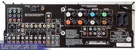 Задняя панель изменилась не сильно: появился дополнительный цифровой выход (электрический коаксиал), выходы предварительного усилителя для всех каналов, а также выходы предусилителя для «зоны 2». Всего этого в TX-SR 601E не было. Хочется отметить, что выход предусилителя не семи, а восьмиканальный. Это значит, что декодер ресивера способен декодировать сигнал по схеме 7.1, поэтому для превращения TX-SR 701 в 7.1 ресивер нужно докупить лишь дополнительный усилитель мощности. С другой стороны, при цене $1340 могли бы сделать семиканальный усилитель изначально — добавить-то надо было всего один канал усиления (6.1 уже есть изначально).