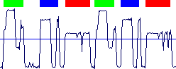 Вертикальная ось — относительная яркость, горизонтальная — время, по ширине график соответствует одному обороту фильтра. По всей видимости, в фильтре действительно семь сегментов, один из которых при выводе белого цвета не используется (провал после первого зеленого сегмента на графике). Частота смены цветов составляет 360 Гц при 60 Гц кадровой развертки. Это много, обычно даже у кинотеатральных DLP-проекторах более высокого класса она составляет 240 Гц. В итоге, эффект «радуги» у данного проектора чуть менее выражен.