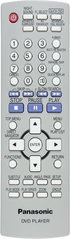 На горизонтальной плоскости свободно расположились 6 круглых кнопочек. Логотипов на ней меньше — всего парочка. Кнопки очень удобные: вогнутые — палец не соскальзывает, с мягким нажатием и небольшим ходом. Правда, к пространственной разнесенности управляющей лотком привода кнопки и им самим приходится некоторой время привыкать. Без этого не обойтись, так как на пульте в лучших традициях Panasonic нет соответствующей кнопки. (Как бы объяснить инженерам-дизайнерам, что когда подходишь к аппарату, чтобы сменить в нем диск, хочется, чтобы лоток уже был выдвинут).