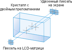 Белое поле: яркий белый с едва заметной неравномерностью. Черное поле скорее воспринимается как очень темно-серое, хотя контраст с белым большой. Когда глаз привыкает к темноте на черном поле становится различимым одно небольшое цветное пятно, зеленого оттенка. Геометрия области проекции, когда проектор расположен на горизонтальной поверхности, имеет небольшое отклонение от параллелепипеда, так что низ изображения чуть уже верха. Это легко устранить, подложив что-нибудь под заднюю ножку. На вертикальной, горизонтальной сетке и на сетке в шахматном порядке различим каждый пиксель, а шума и муара нет. Шкала серого с достаточным количеством оттенков, без отклонений от серости. Цвета воспроизводятся достоверно, ярко и обладают большой глубиной. Хроматические аберрации объектива плюс возможное небольшое несведение в самом худшем случае (в верхних углах) составляют не более 0,75 пикселя. Интерполяция из разрешений ниже или выше чем 960 на 540 пикселей проводится достаточно хорошо. Максимальная вертикальная частота при исходном разрешении 600 на 800 — 85 Гц, 1024 на 768 — не менее 85 Гц, 1280 на 1024 — 85 Гц и 1600 на 1200 пикселей — 75 Гц. Сетка пикселей неразличима! Вот мы и подошли к главной особенности данного проектора. Это фирменная технология, позволяющая избавиться от темных промежутков между пикселями на изображении. Ее суть понятна из рисунка: