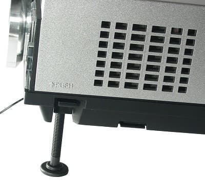 Снизу расположены две передние пластмассовые хлипкие на вид выдвижные ножки с фиксаторами положения и одна широкая резиновая задняя. Вращать ножки для тонкой подстройки неудобно, так как не за что. Резиновые нашлепки на ножках не дают проектору скользить на гладких поверхностях. Полупрозрачная защитная крышка объектива прикреплена к корпусу проектора на пластиковом шнурке.