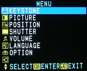 В режиме 4:3 в меню OPTION пункт 4:3 H-POS позволяет выбрать центральное, крайнее правое или крайнее левое положение картинки на экране. Только через меню (пункт SHUTTER в главном меню) доступно временное отключение проецирования на экран (которое восстанавливается при нажатии на любую кнопку), и наоборот, только кнопкой FREEZE на пульте можно «заморозить» картинку. В меню выбирается тип проекции (фронтальная / на просвет, обычное / потолочное крепление). Проектор среднефокусный, поэтому при фронтальном проецировании будет располагаться около зрителей, притом скорее даже перед ними.