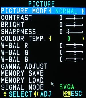 При подключении к источнику телевизионного формата SECAM (видеовыход телевизора; прием на комнатную и телевизионную антенну) проектор продемонстрировал стабильное и четкое изображение, но со слегка искаженным цветовым балансом, который, впрочем, практически полностью устраним с помощью соответствующих регулировок в меню PICTURE. К сожалению незначительное ухудшение качества сигнала приводило к возникновению цветовых помех.