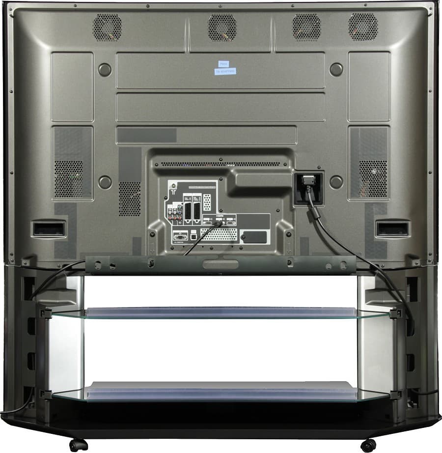 Слева от крышки расположены механический выключатель питания, индикатор состояния (неяркий, светится красным в режиме ожидания и зеленым — при работе), датчик освещенности и ИК-приемник, справа — индикатор присутствия SD-карты в слоте. Между серебристой накладкой и рамкой экрана в глубине находится узкая зеркальная вставка. Кажется, что телевизор не имеет динамиков, но звук и неприметные решетки, которые можно обнаружить при взгляде снизу, выдают наличие встроенных источников звука. Кожух, прикрывающий заднюю панель, выштампован из тонкого листа алюминиевого сплава и имеет матовое темно-серое покрытие. Разъемы для стационарного подключения к аппаратуре находятся в неглубокой нише чуть ниже центра задней панели. Ориентированы эти разъемы назад, перпендикулярно экрану.