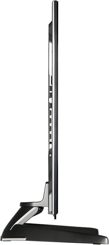 Их использование облегчает подсказка, появляющаяся на экране точно напротив кнопок при первом нажатии на любую кнопку. Пластиковый хомут (он закрепляется в одном из отверстий на задней панели), входящий в комплект поставки, поможет стянуть отходящие кабели в аккуратный пучок. На задней панели находятся прикрытые серыми заглушками 4 резьбовых отверстия, предназначенные для монтажа на настенном кронштейне. Охлаждение пассивное — воздух проходит через отверстия на задней панели. Основание подставки имеет элегантную V-образную форму.