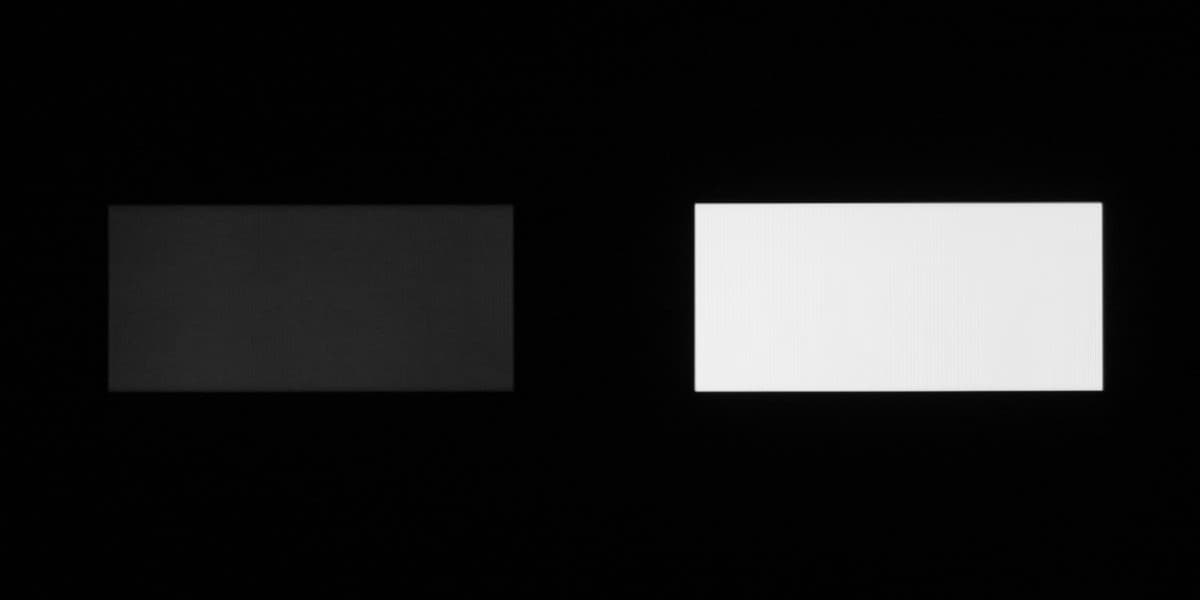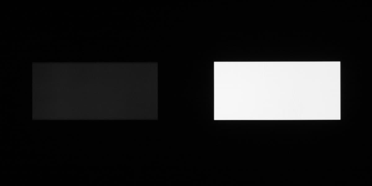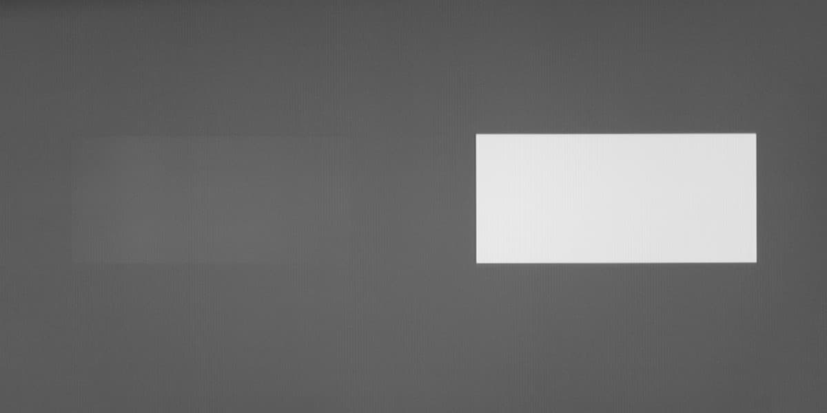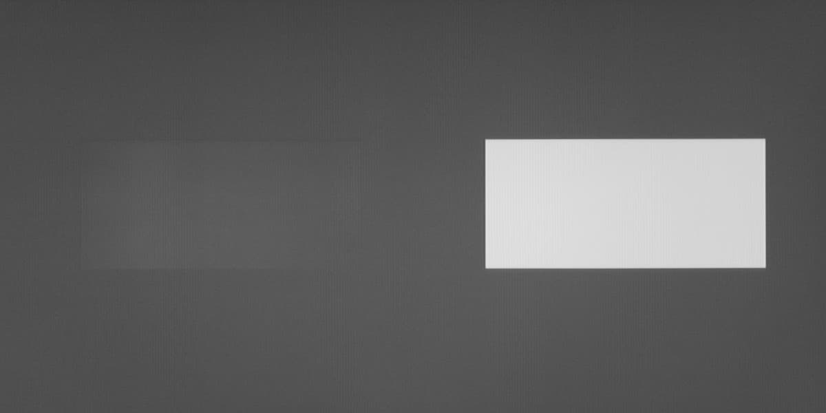 Аппаратные измерения показали, что контрастность высокая, равномерность белого поля хорошая, а равномерность черного, и как следствие контрастности приемлемая. На черном поле можно заметить вариацию засветки по площади экрана: