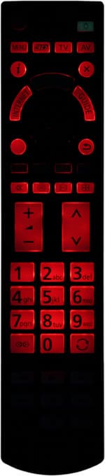 Пульт используется в точности такой же, которым комплектуется телевизор Panasonic VIERA TX-LR42DT50. Черный пластиковый корпус пульта состоит из двух половинок — верхняя имеет зеркально-гладкую поверхность (неустойчивую к появлению царапин), нижняя — матовую. Форма корпуса пульта эргономичная, а расположенные вдоль корпуса элементы питания улучшают балансировку. Часто используемые кнопки выполнены большими и имеют крупные контрастные обозначения. Пульт оснащен двумя ИК-излучателями: один направлен вперед, другой вперед и вниз, что позволяет держать пульт направленным немного вверх — так удобнее, и обозначения кнопок лучше видно. Большая часть кнопок оснащена достаточно яркой и равномерной светодиодной подсветкой, включающейся фосфоресцирующей кнопкой LIGHT. Выключается подсветка ей же или через несколько секунд после последнего нажатия на кнопки. Подсветка значительно облегчает использование пульта в темном помещении.