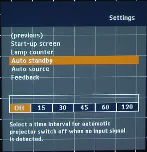 На этой же странице можно отключить заставку при старте, активизировать функцию автоматического отключения проектора при длительном отсутствие сигнала и отключить экранные сообщения.