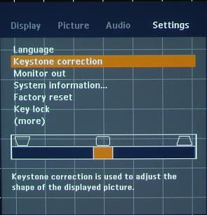 В на странице меню Picture в пункте Mirror выбирается тип проекции (фронтальная / на просвет, обычное / потолочное крепление). Проектор определенно длиннофокусный, поэтому может быть расположен за зрителями.