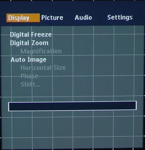 Текущий кадр останавливается с помощью кнопки D-Freeze пульта ДУ или пункта Digital Freeze на странице Display экранного меню. На той же странице пункт Digital Zoom (его дублер — кнопка D-Zoom на пульте) отвечает за включение режима цифрового увеличения. При этом параметр Magnification определяет степень увеличения, а курсорными кнопками перемещается область увеличения. Нажатие на кнопку A/V Mute пульта временно убирает изображение с экрана и выключает динамик проектора.