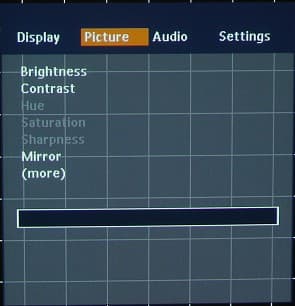 Экранное меню простое и понятное. Состоит из четырех страниц (Display, Picture, Audio и Settings).