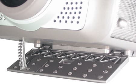 Такая конструкция позволит проектору очень устойчиво стоять на ровных поверхностях, но на неровных он может качаться, и придется под ножки что-нибудь подкладывать, так как высота задних ножек не регулируется. У проектора нет резьбовых отверстий для крепления к кронштейну — для потолочного крепления придется использовать специальный кронштейн от Philips.