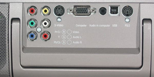 Источники сигнала последовательно перебираются кнопками Source на пульте или на проекторе. Но эти кнопки могут и не понадобиться, так как по умолчанию включена функция определения активного входа. Достаточно сначала подключить источник видеосигнала, а затем включить проектор. Набор различных видеовходов хороший: компьютерный VGA (mini D-sub 15 pin), компонентный, S-Video, композитный.