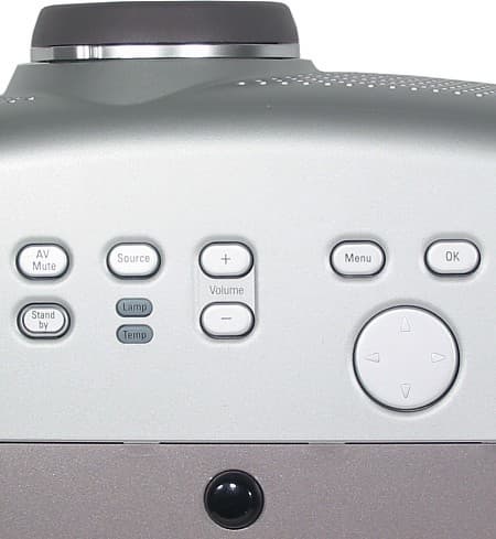 Дизайн неплохой, внешне проектор напоминает плотно сбитый «бумбокс». Сходство дополняют металлические решетки вентиляции по бокам: за такими обычно прячут динамики. Впрочем, один динамик под решеткой на левом боку есть и у этого проектора. Все разъемы, кроме питания, находятся на правом боку — подключаться удобно. Сзади — разъем питания и разъем для замка Кенсингтона. Сверху — 7 просто кнопок, одна четырехпозиционная навигационная и 2 индикаторных светодиода. Под кнопкой Stand by расположен еще один светодиод.