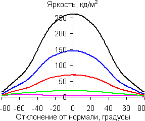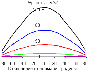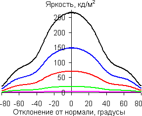 Графики показывают, что яркость экрана при выводе белого цвета и оттенков серого плавно меняется при отклонении от нормали к экрану по горизонтали и по вертикали, при этом графики полутонов не пересекают друг друга. Контрастность, как в горизонтальном, так и в вертикальном направлениях остается высокой вплоть до 78 градусов (156 в сумме). В диагональном направлении из-за значительного увеличения яркости черного поля контрастность уже при 50-60 градусах становится меньше 10:1, и при 78 градусах опускается почти до 5:1.
