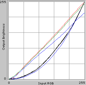 Цветовая температура на различных участках шкалы серого варьируется несильно, но она выше целевых 6500 К, особенно в случае RL-26D50D. То есть цвета телевизоров холодные. Далее приведены графики гамма-кривых, где можно увидеть, насколько гамма-кривые индивидуальных цветов (черные линии) отклоняются от целевой гамма-кривой (синяя линия), и какая требуется коррекция для каждого цвета (соответственно, красная, синяя и зеленая линии).