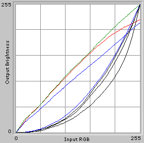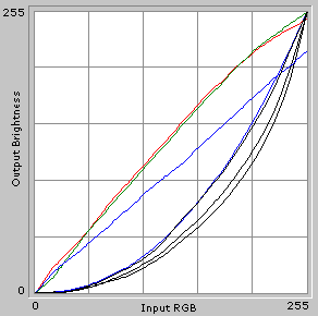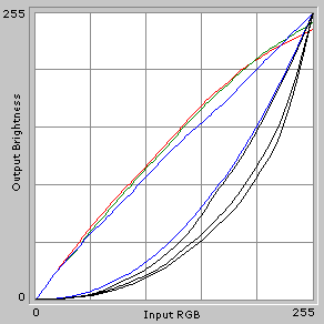 Ниже приведены графики гамма-кривых, где можно увидеть, насколько гамма-кривые индивидуальных цветов (черные линии) отклоняются от целевой гамма-кривой (синяя линия) и какая требуется коррекция для каждого цвета (соответственно красная, синяя и зеленая линии).