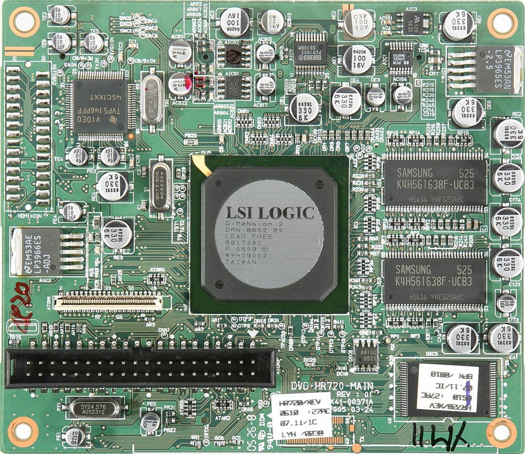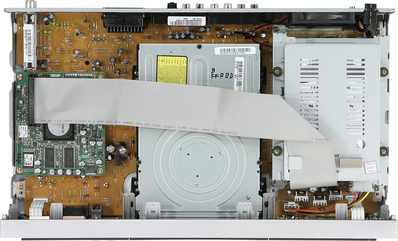 Рекордер основан на популярном мультимедийном процессоре DiMeNsion-8652 от LSI Logic. За оцифровку видеосигнала отвечает мультиформатный видеодекодер/АЦП TVP5146PFP. ВидеоЦАПы встроены в DMN-8652. В рекордере используется двухканальный аудиоЦАП PCM1742 (THD+N = 0.002%, SNR = 106 дБ), а усиливает аналоговый аудиосигнал парочка операционных усилителей S4560. Оцифровка стереосигнала возложена на двухканальный аудиоАЦП PCM1802 (THD+N = 96 дБ, SNR = 105 дБ). Декодирует NICAM-стереозвук аудиопроцессор, расположенный на обратной стороне большой желтой платы, и до него мы не добрались. Как и следовало ожидать, многие компоненты рекордера изготовлены на фабриках Samsung. Как минимум это — микросхемы памяти, главные микросхемы DVD-RAM-привода (а может и он сам), ВЧ-ТВ-сборка и винчестер на 80 Гбайт. Винчестер рекордера находится в корзине из толстого железа, которая, видимо, служит и радиатором. Для защиты жесткого диска от вибраций корзина закреплена не жестко, а на резиновых втулках. Большой и малошумящий вентилятор выдувает нагретый воздух из рекордера.