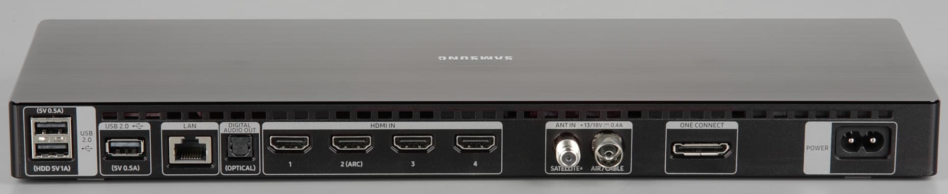 Напомним, что в нише на задней панели телевизора всего два разъема — питания и от модуля One Connect, представляющего собой небольшую (362×115×32 мм) прямоугольную коробку.