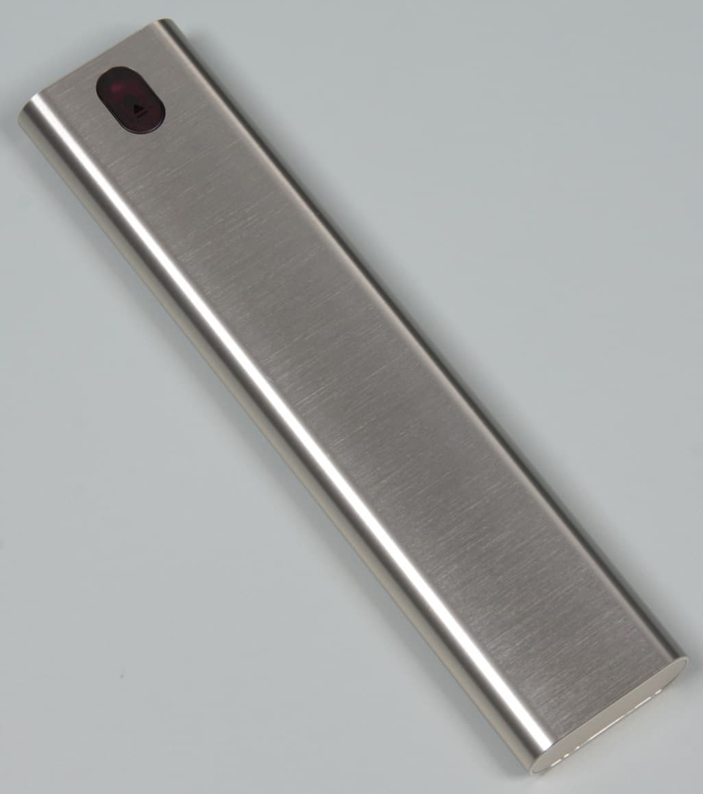 Пульт имеет оригинальную конструкцию. Нажав на кнопочку снизу, можно сдвинуть назад алюминиевый кожух.