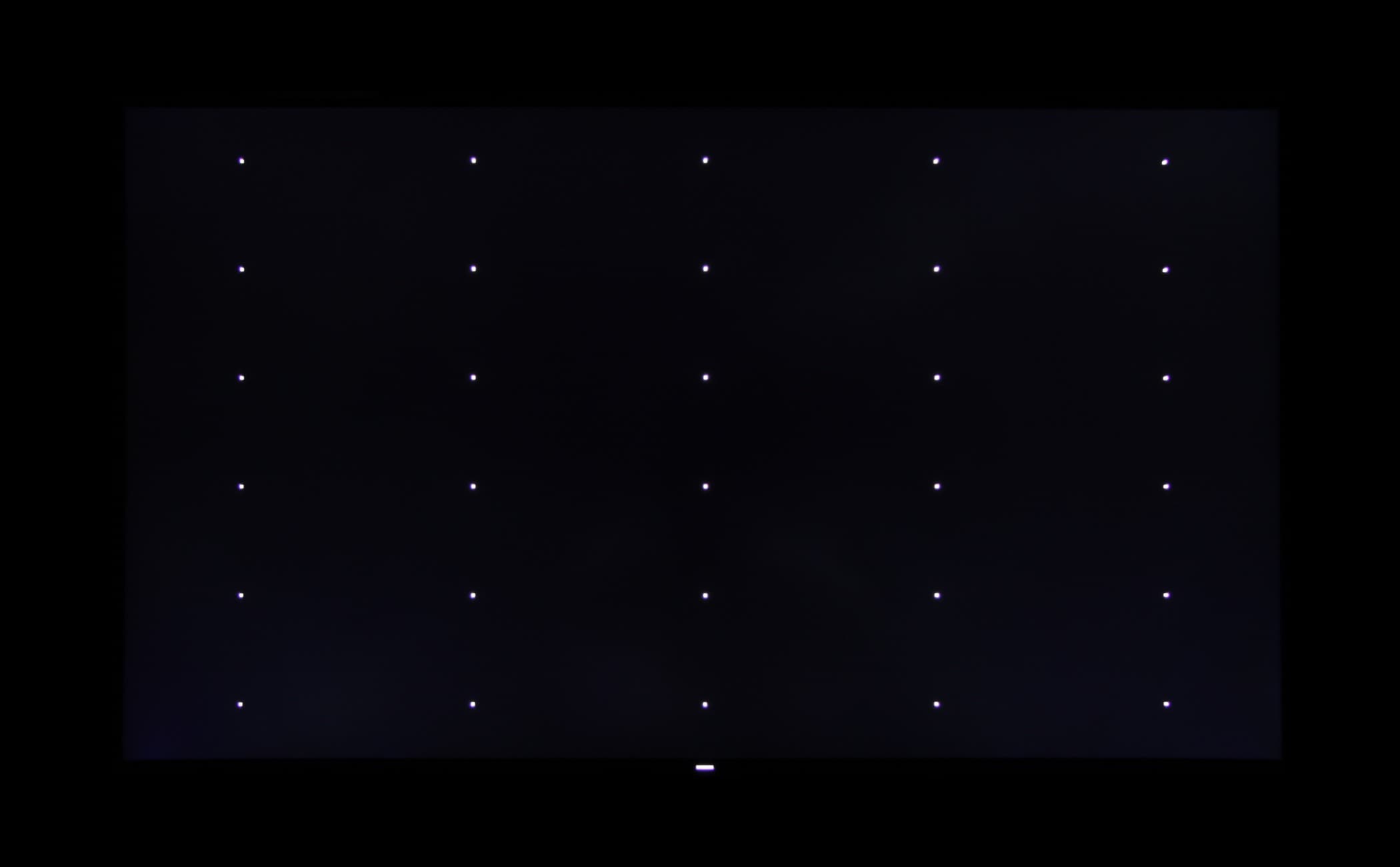 Аппаратные измерения показали, что контрастность высокая, равномерность белого поля хорошая, а равномерность черного несколько хуже. Яркость белого поля заметно снижается к вертикальным границам экрана. Реальное распределение засветки черного по всей площади экрана увидеть практически невозможно из-за указанной очень быстрой и агрессивной динамической подстройки яркости подсветки. О равномерности черного поля дает представление фотография тестового изображения с сеткой из белых точек: