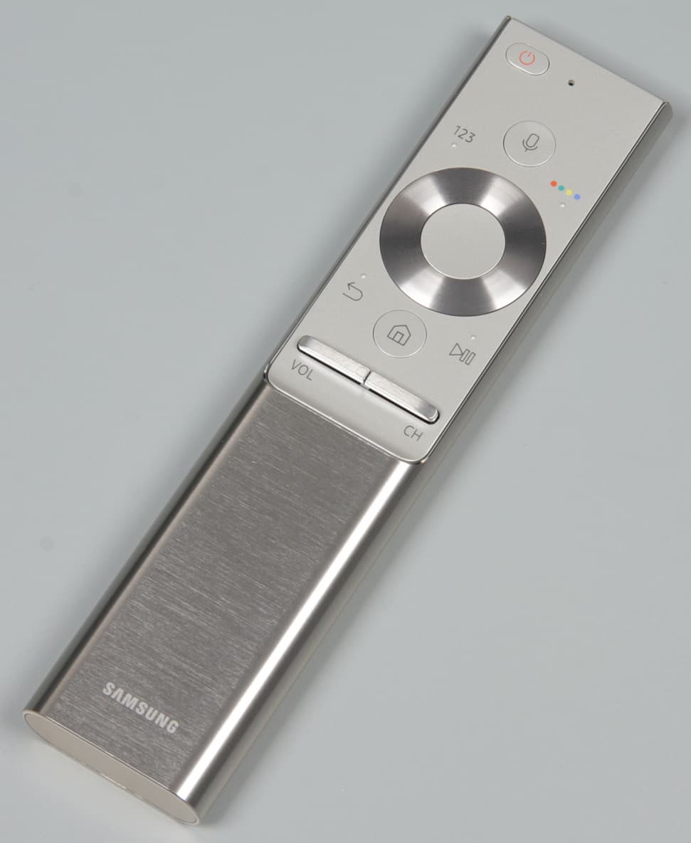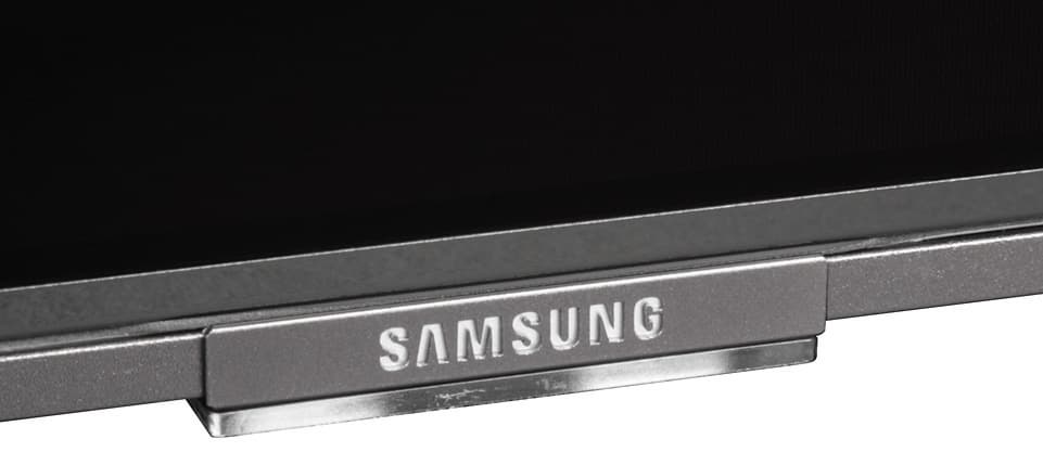 Внизу по центру обрамления закреплена небольшая прямоугольная алюминиевая соединительная вставка в цвет рамки по периметру. На фронтальной плоскости этой вставки есть логотип, выполненный в виде трафарета. Подложка под логотипом белая, она оснащена светодиодной подсветкой, которую можно отключить в меню установок. На нижнем торце вставки есть накладка из пластика, по большей части с блестящим металлическим покрытием. На накладке размещены единственная механическая кнопка, с помощью которой можно очень ограниченно управлять телевизором без помощи пульта ДУ, ИК-приемник пульта ДУ, датчик внешней освещенности и индикатор состояния. Индикатор неяркий, в дежурном режиме он горит красным.