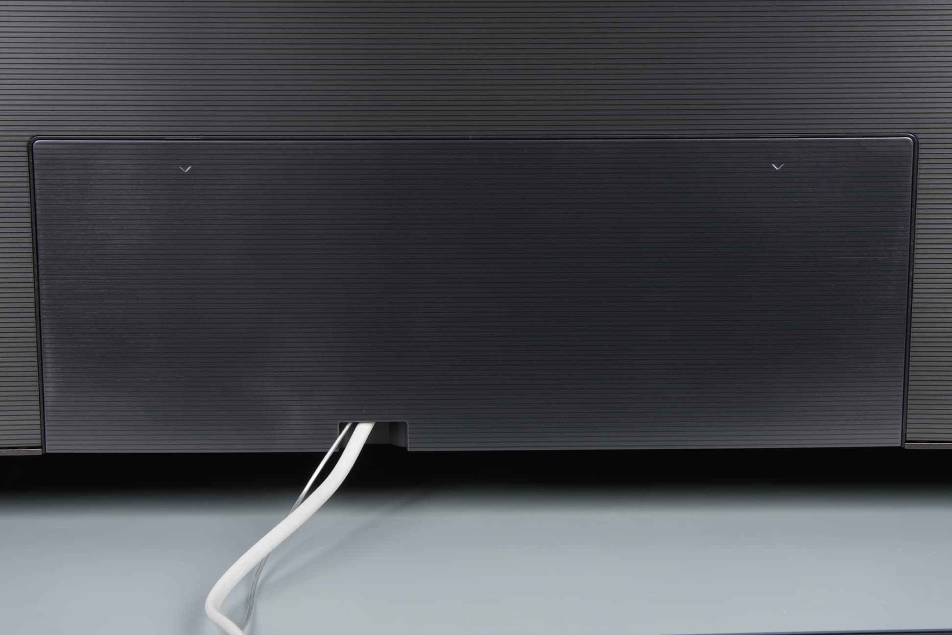 Воздух для охлаждения электроники проходит через решетки на нижнем торце блока экрана и в верхней части задней панели. Телевизор имеет полностью пассивное охлаждение. На нижнем торце за решетками дальше от центра можно разглядеть вытянутые диффузоры двух громкоговорителей. Звук от средне- и низкочастотных громкоговорителей, размещенных внутри корпуса телевизора, выходит через решетки и рупоры там же на нижнем торце.