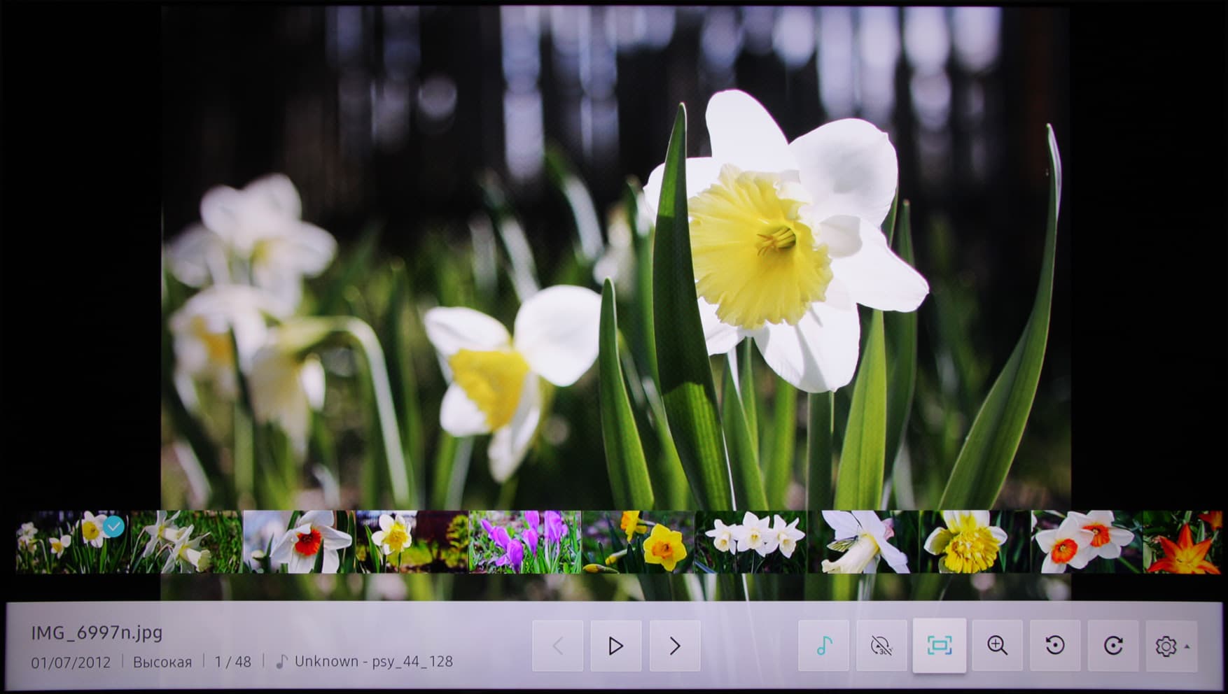 При поверхностном тестировании воспроизведения мультимедийного контента мы ограничились рядом файлов, запускаемых в основном с внешних USB-носителей. Были опробованы жесткие диски, внешние SSD и обычные флешки. Отметим, что телевизор поддерживает USB-накопители как минимум с файловыми системами FAT32, exFAT и NTFS, а с кириллическими названиями файлов и папок не было никаких проблем. Нами подтверждена способность телевизора показывать растровые графические файлы в форматах JPEG, PNG и BMP, в том числе в виде слайд-шоу с эффектами перехода и под выбранную фоновую музыку.