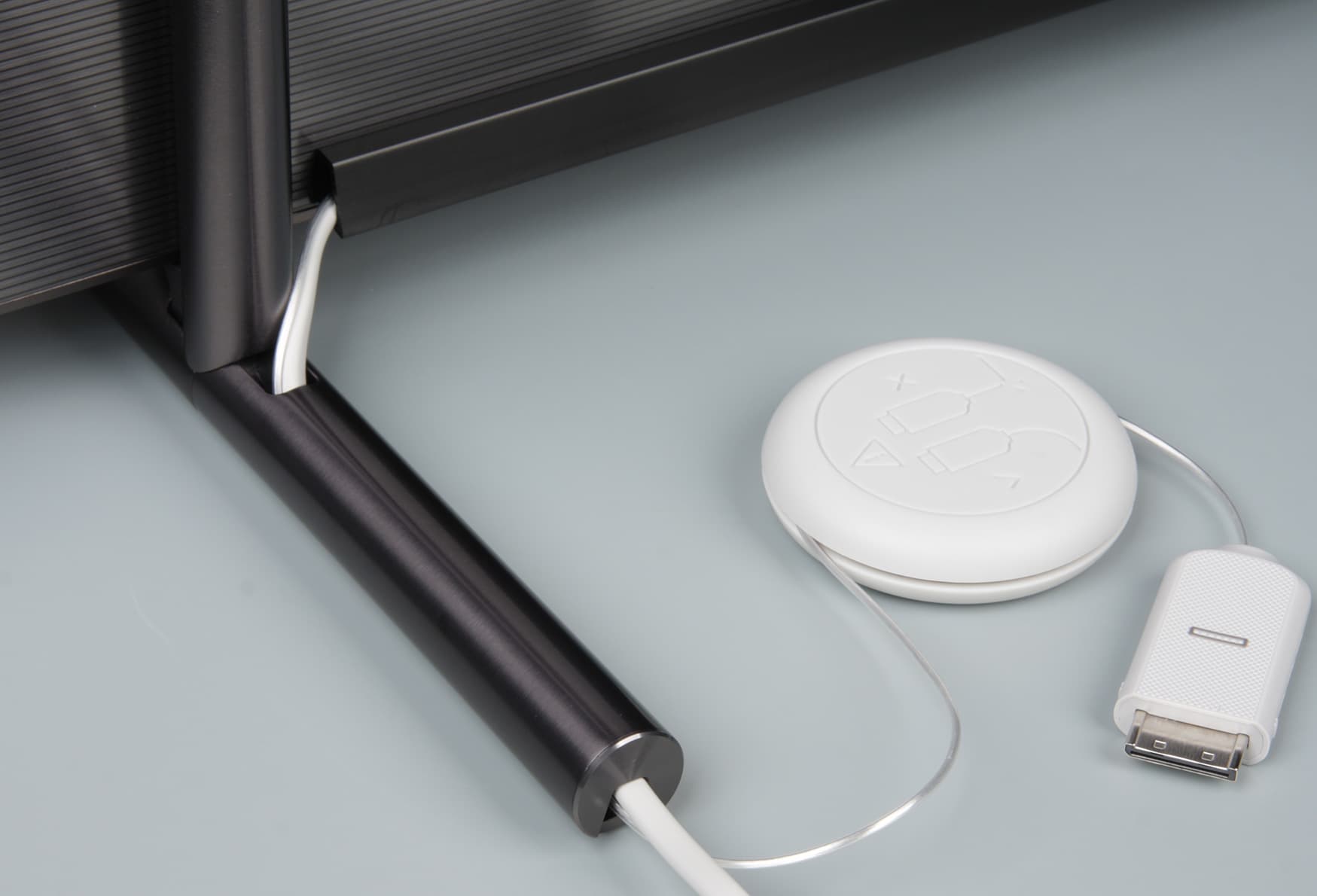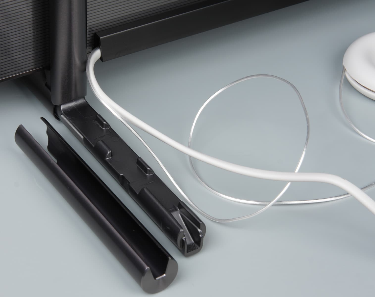 И конечный результат — надвинутый на ножку кожух фиксирует кабели на месте и скрывает их.