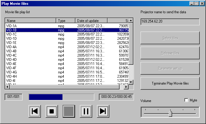 Показ видеофайлов. Создав список из одного или нескольких видеофайлов их можно запустить на проигрывание, при этом по сети передается только содержимое видеофайла, а проектор сам его декодирует и воспроизводит видео со звуком.