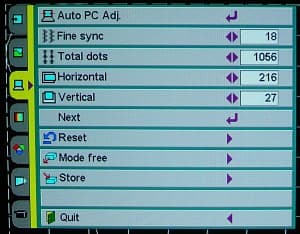 Видеовходы поделены на две группы: COMPUTER IN (VGA и SCART-RGB через переходник) и VIDEO IN (композитный, S-Video и компонентный). Кнопка INPUT на пульте или на корпусе проектора позволяет переключаться между ними. Выбор режима входа COMPUTER IN происходит через меню, а VIDEO IN — или через меню или с помощью группы кнопок VIDEO на пульте. Если выбрать режим AUTO, то проектор будет автоматически сканировать видеовходы в порядке компонентный — S-Video — композитный в поисках первого активного. В меню можно указать тип видеосигнала (при композитном, S-Video и компонентном подключении) или оставить активной опцию автоматического определения. В случае VGA-подключения доступны множество тонких настроек, для сохранения которых предусмотрено 5 ячеек памяти.
