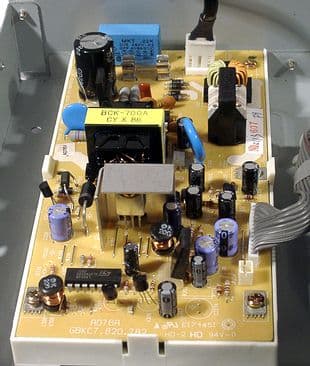 Слева от DVD-привода находится блок питания. Он выполнен по импульсной схеме, монтаж аккуратен, экранировка отсутствует.