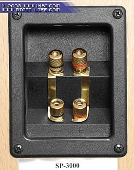 Корпус изготовлен из тех же 12-миллиметровых листов прессованного картона, из которых сделан корпус SP-3000. разъёмы в данном случае обычные, пружинные. В общем-то, ничего в этом зазорного нет, учитывая предназначение и класс АС. Сечение колоночного кабеля не должно превышать 1,5 мм², иначе кабель просто не влезет в разъём. В данном случае производитель не дал промаха, поскольку такого сечения за глаза хватит для этих небольших колонок. Присутствует возможность крепления АС к стене (паз для шляпки гвоздя или шурупа сделан прямо в блоке разъёмов — см. фото выше). Также отрадно видеть, что колонки имеют акустическое оформление «закрытый корпус», позволяющее менее щепетильно относиться к их размещению вблизи стен.