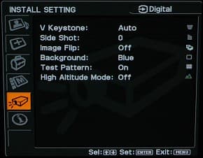 В меню INSTALL SETTING параметр Image Flip поможет правильно настроить изображение при различных типах проекции (фронтальной / на просвет, обычное / потолочное крепление). Проектор среднефокусный, поэтому при фронтальном проецировании должен быть расположен или перед, или на линии зрителей. Существует возможность увеличить или уменьшить фокусное расстояние объектива с помощью двух соответствующих опциональных линз-насадок.